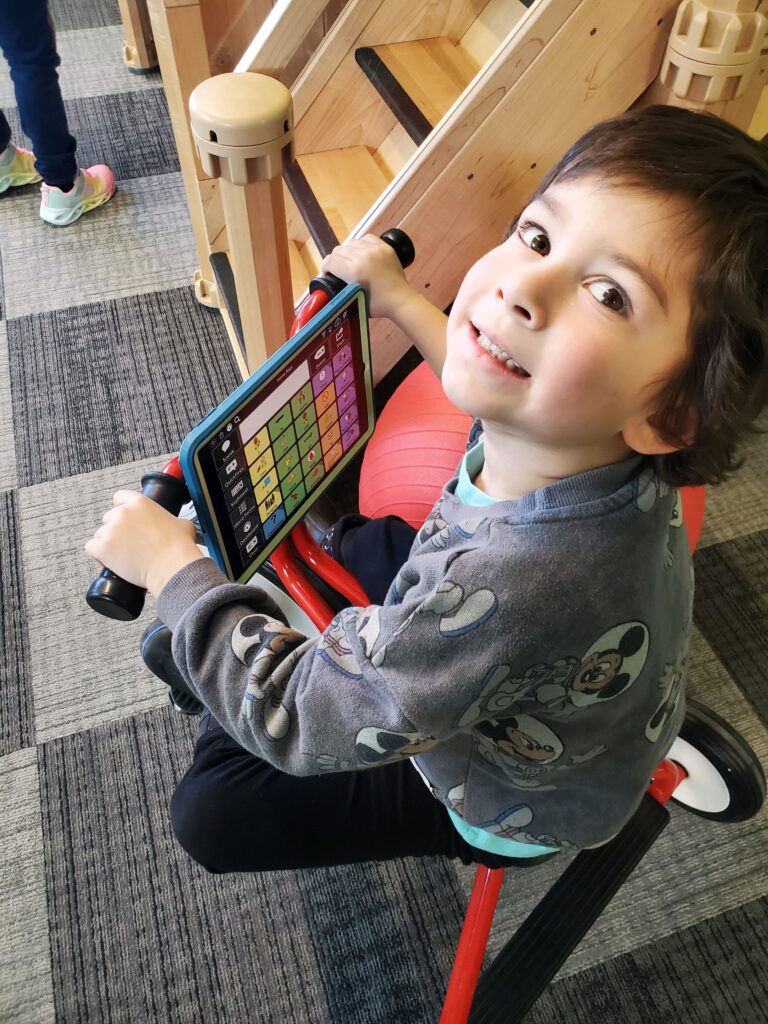 “It opened up a world that is just tremendous,” she continued. “He hit the ground running with it and calls it his ‘talker.’ He even figured out a way to hook it on his tricycle so it doesn’t fall off.”
