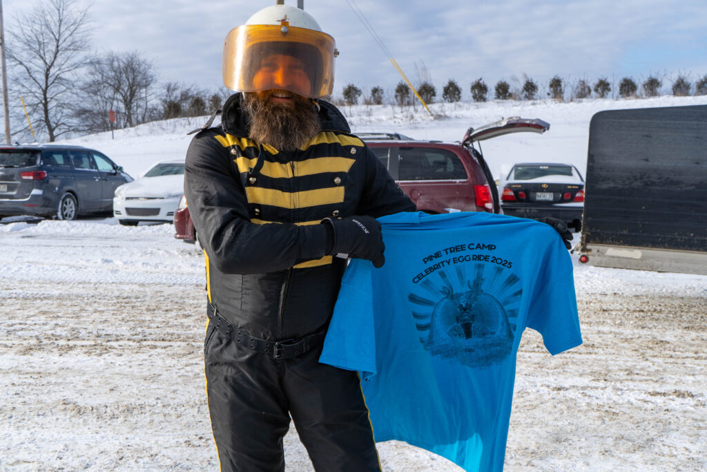 Chainsaw artist, Josh Landry, can sculpt wood into practically anything. We bet he can even carve a tree into an egg! But can he fill his snowmobile suit with eggs?… When you donate $50 he’ll smush another egg into his suit before hitting the trail at the Pine Tree Camp Egg Ride.